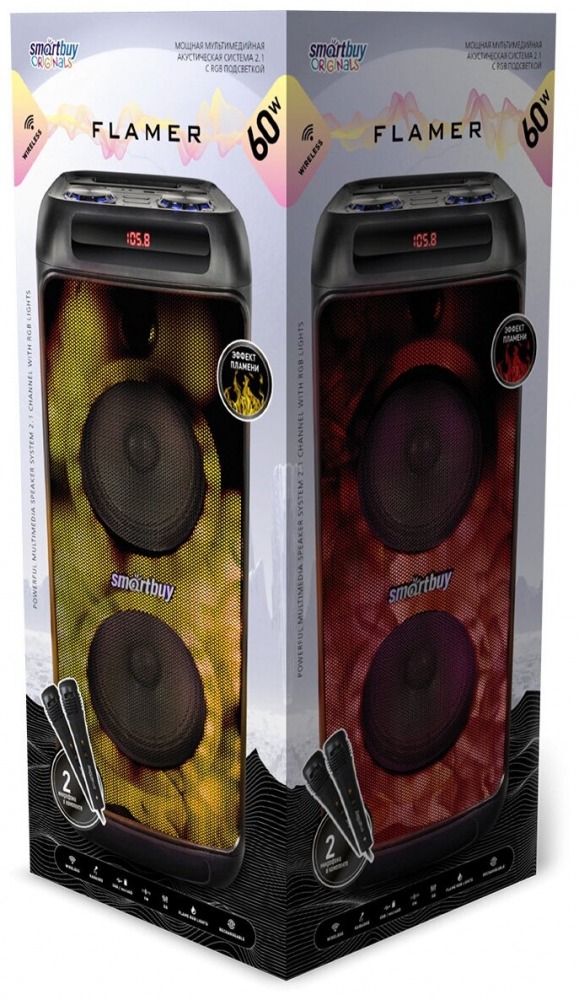 Описание Портативная колонка 2.1 Smartbuy FLAMER (Bluetooth/USB/FT/AUX/2 микроф/60Вт) 270x620x260 черный