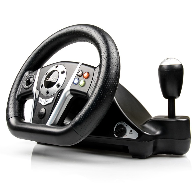 Управление: Рулевое колесо, педальный блок (две педали), двухпозиционный рычаг переключения скоростей. На рулевом колесе: 2 подрулевых лепестка для переключения скоростей, аналоговый стик, 4-кнопочная крестовина управления, крупная кнопка в центре, 2 кнопки Select и