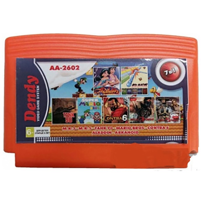 Описание Картридж Dendy AA-2602 (MK3, MK5, Arkanoid, Contra 6, Aladdin, Mario Bros, Tank 90)