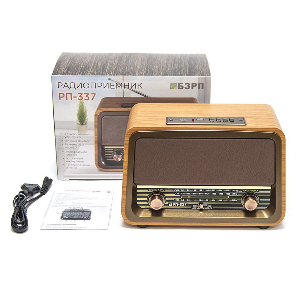 Радиоприёмник БЗРП РП-337 УКВ 88-108МГц,СВ,КВ, (220В,DC6В, акб1200mAh BT, USB,microSD)
