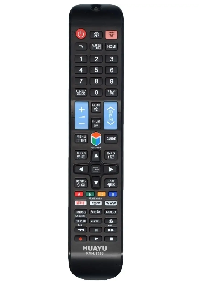 Универсальный телевизионный пульт дистанционного управления HUAYU RM-L1598 для телевизоров SAMSUNG / САМСУНГ. Пульт ДУ работает без какой-либо настройки с любым телевизором марки Samsung, в том числе подойдет для Smart TV (Смарт ТВ) Samsung. Выбирайте этот ПДУ, если он устраивает вас по функционалу и внешнему виду, рекомендуется для замены пультов в схожих корпусах для вашего удобства. Внимание! Некоторые функции могут быть не доступны с вашей моделью ТВ, если на родном пульте не было таких кнопок. RM-L1598 заменяет следующие модели пультов: AA59-00581A, BN59-01198Q, AA59-00790A, AA59-00638A, BN59-01198X, AA59-00582A, AA59-00621A, AA59-00639A, AA59-00652A, AA59-00797A, AA59-00801A, AA59-00809A, AA83-00655A, BN59-01198C, BN59-01178F и другие.