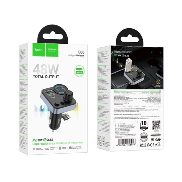 Авто FM модулятор HOCO E86 (2USB QC3.0/PD 30W/дисплей) черный