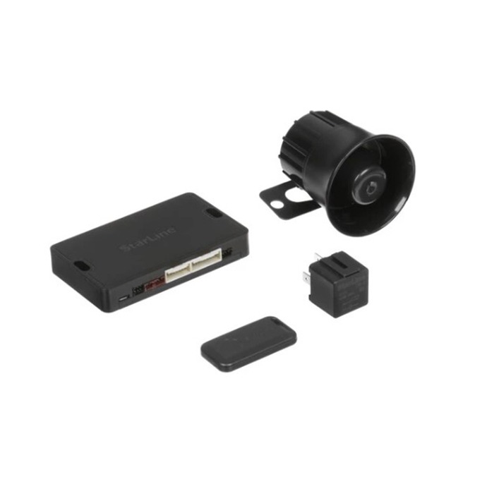 SIM-карта, брелок-метка, документация, основной блок, предохранитель с держателем, реле, сервисная кнопка, сирена, установочный комплект
