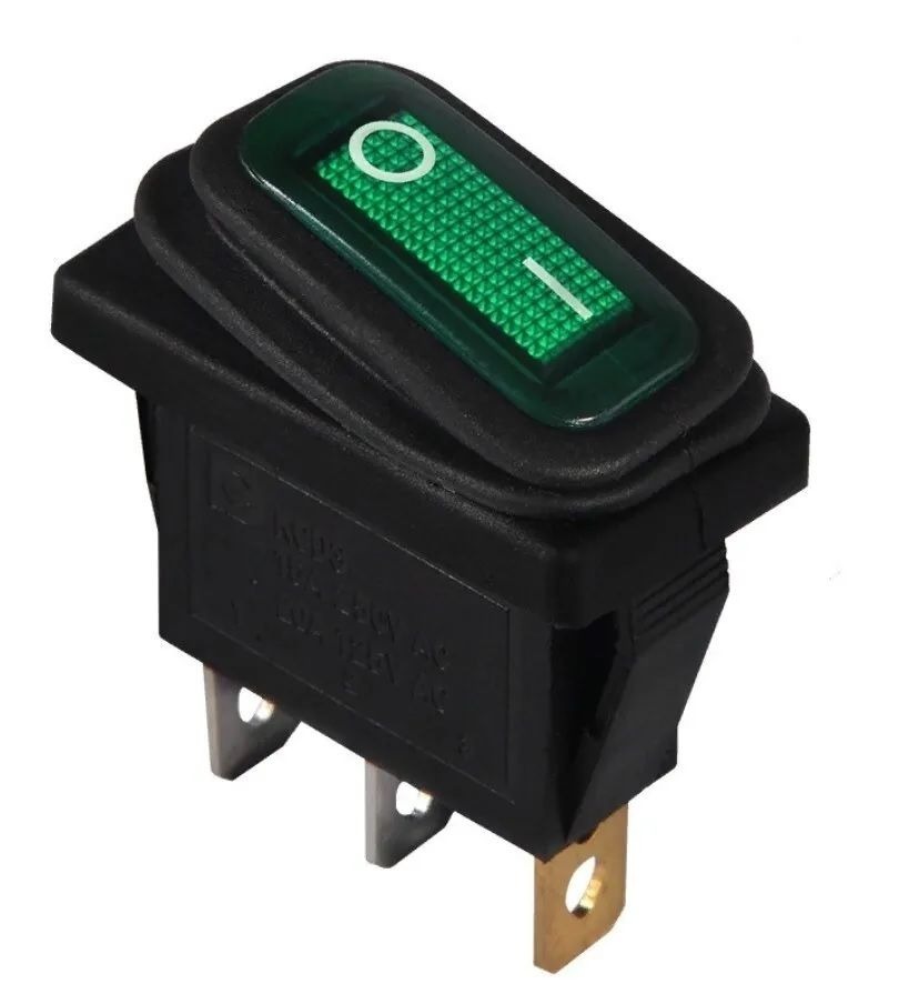 Переключатель узкий с влагозащитой KCD3-101/NW on-off 3 контакта 220В (зелёный)
