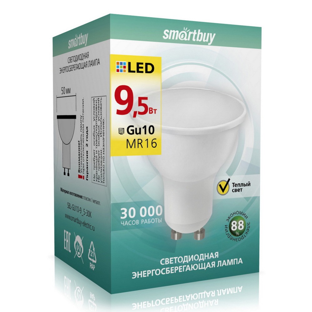 Лампа светодиодная SMARTBUY GU10 (MR16) 9,5Вт 220V 3000K (теплый свет) (10/100)