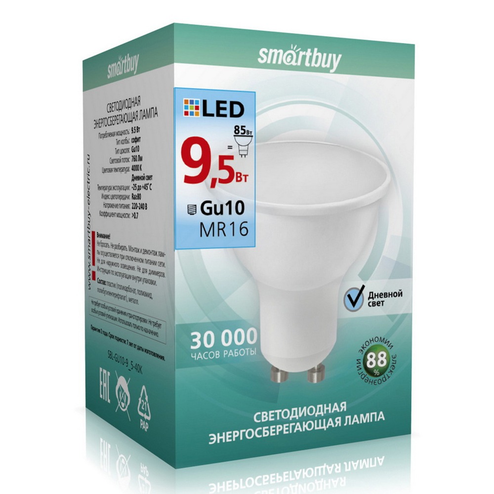 Лампа светодиодная SMARTBUY GU10 (MR16) 9,5Вт 220V 4000K (нейтральный свет) (10/100)