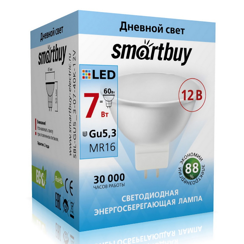 Лампа светодиодная SMARTBUY GU5.3 (MR16) 7Вт 12V 4000K (рефлекторная, холодный свет) (10/100)
