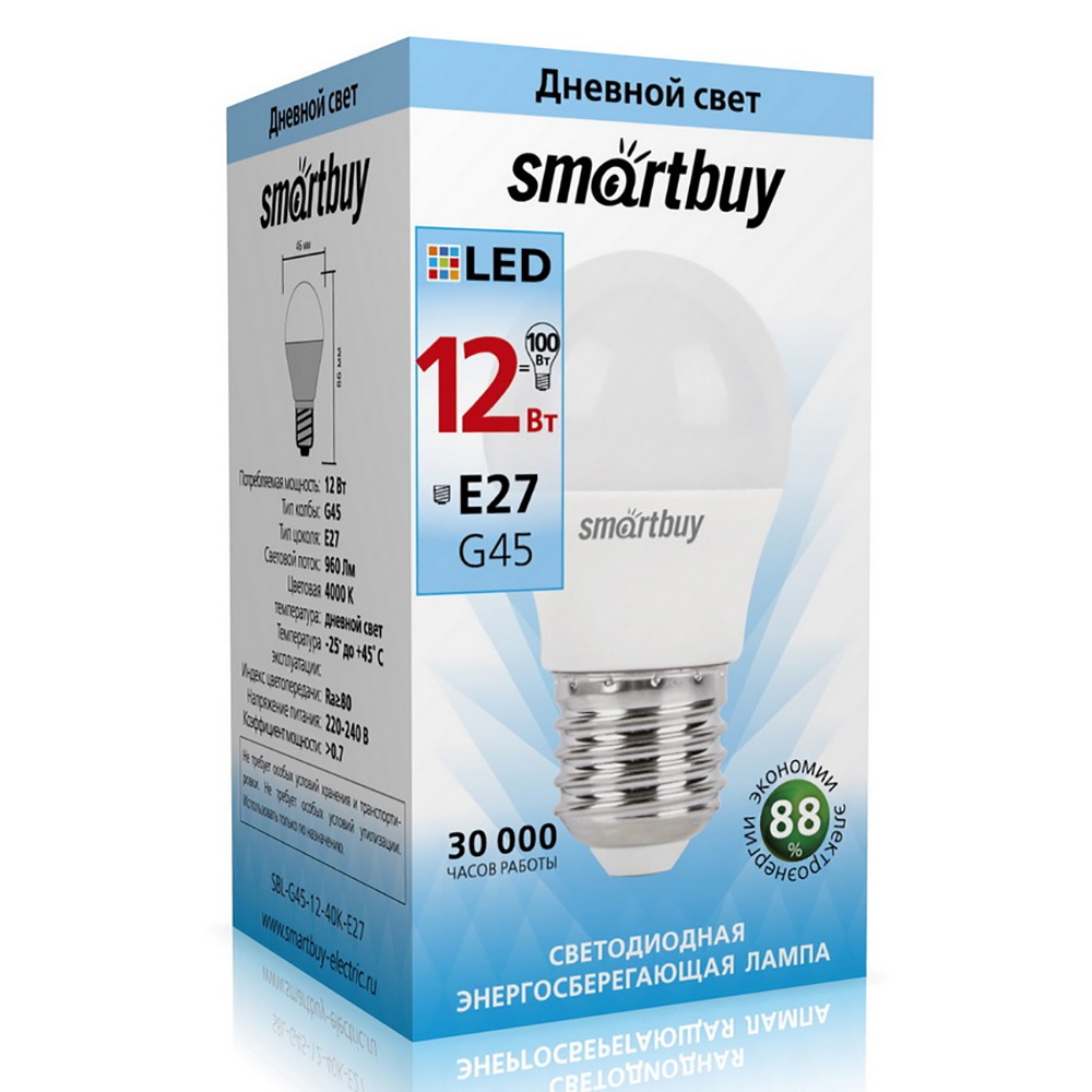 Лампа светодиодная SMARTBUY G45 12Вт 220V 4000K E27 (нейтральный свет) (10/100)