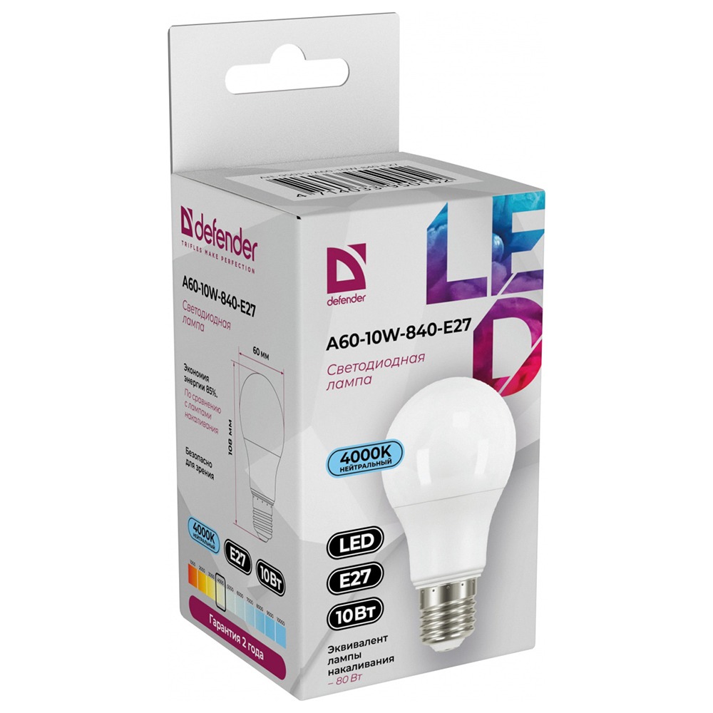 Лампа светодиодная DEFENDER A60 10Вт E27 4000К груша нейтральный белый (10/100)