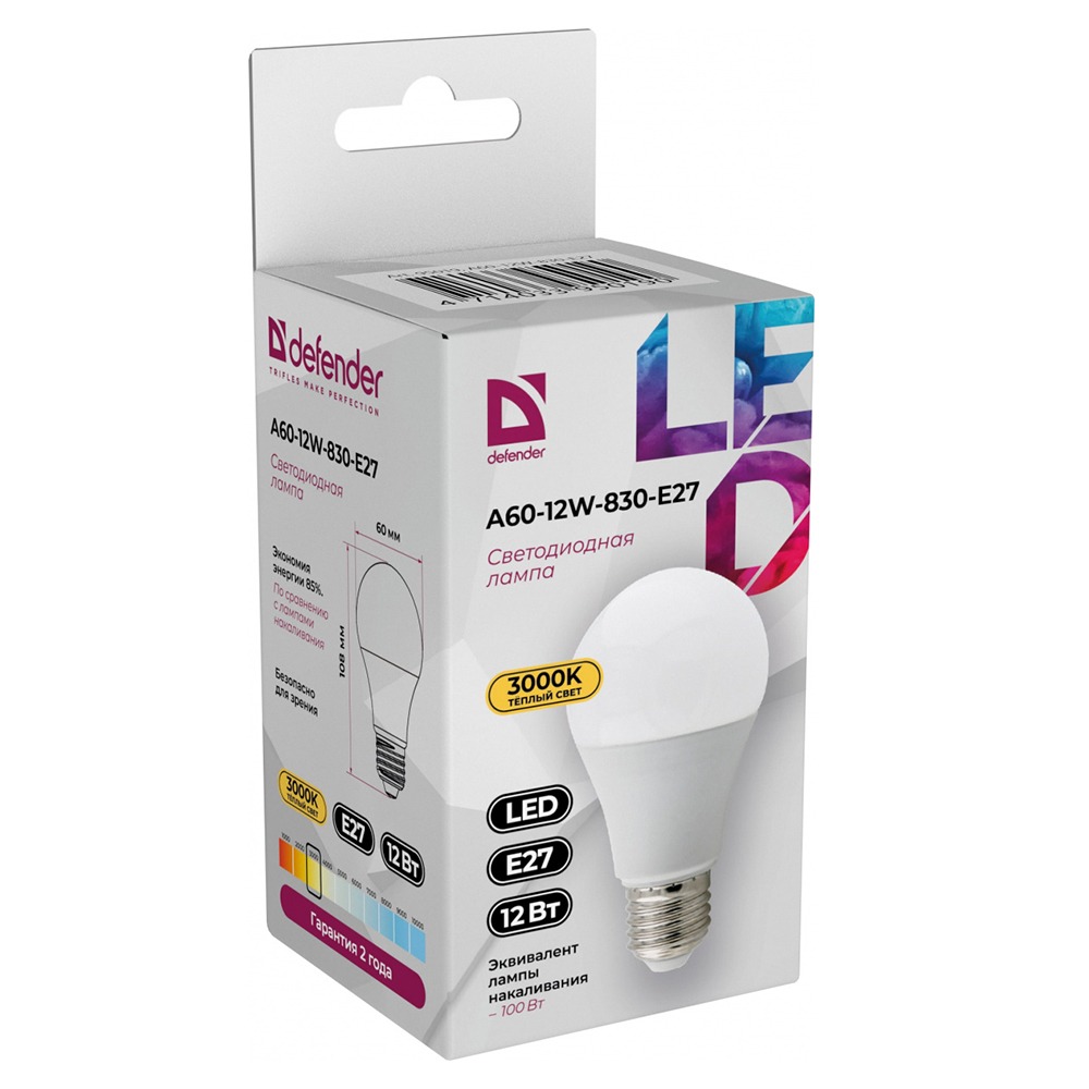 Лампа светодиодная DEFENDER A60 12Вт E27 3000К груша теплый белый (10/100)