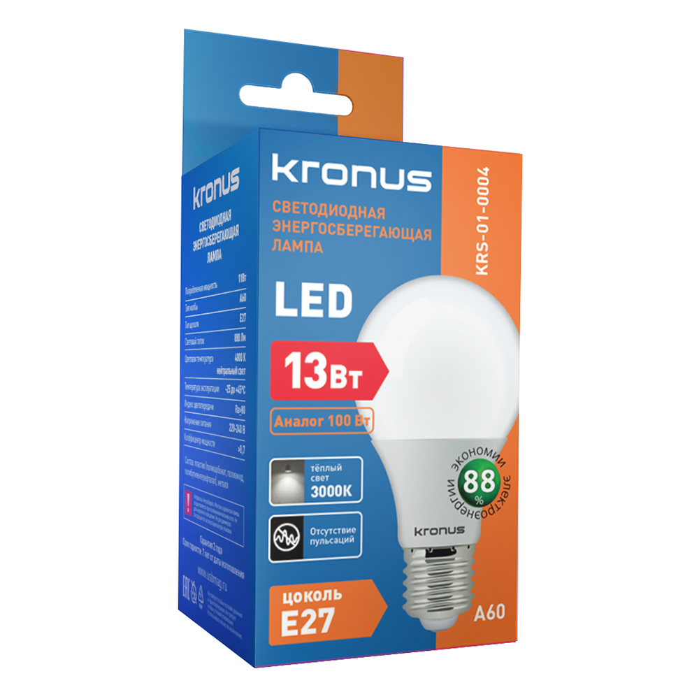 Лампа светодиодная KRONUS A60 груша 13 Вт 220V 3000K E27 тёплый свет (10/100)