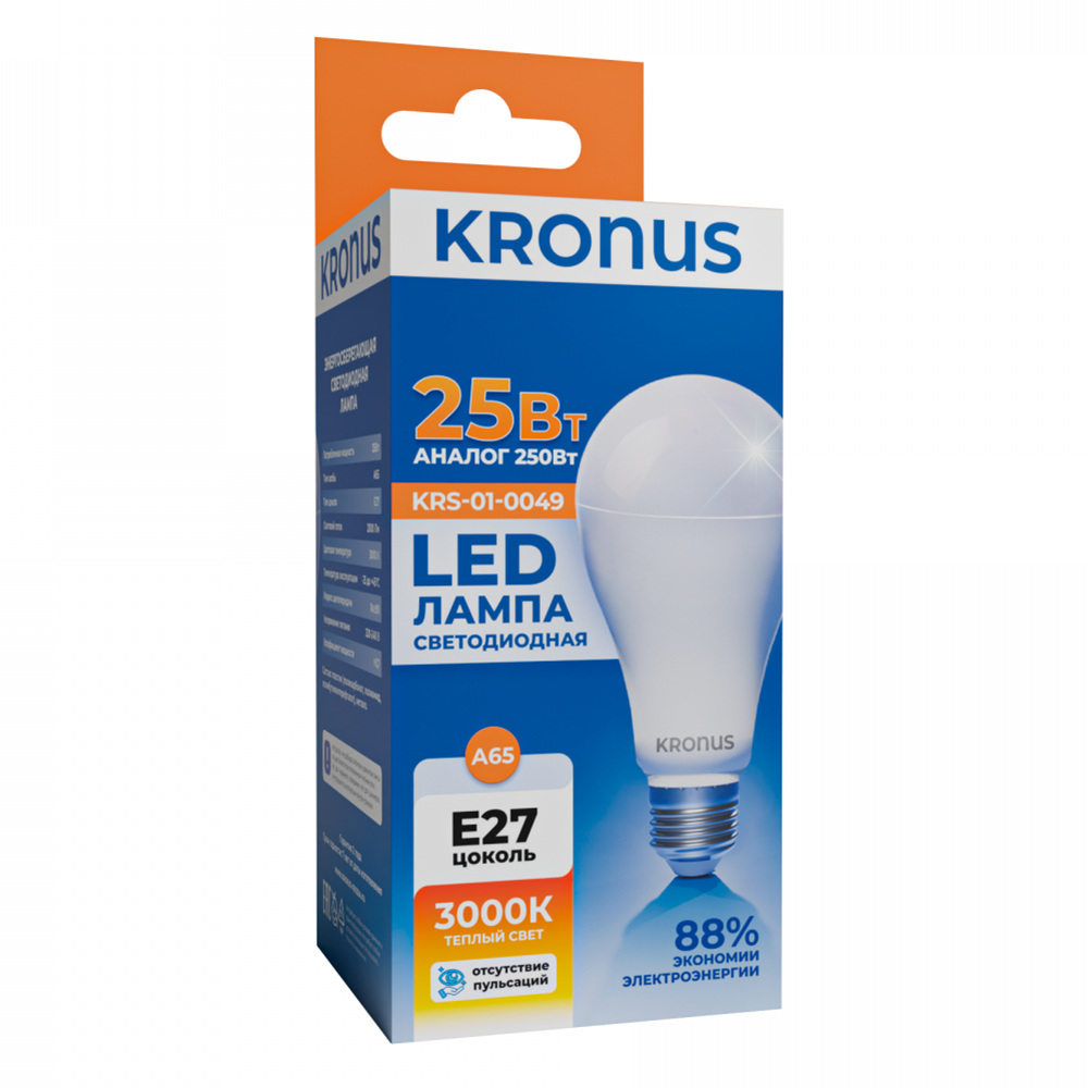 Лампа светодиодная KRONUS A65 груша 25 Вт 220V 3000K E27 тёплый свет (10/100)