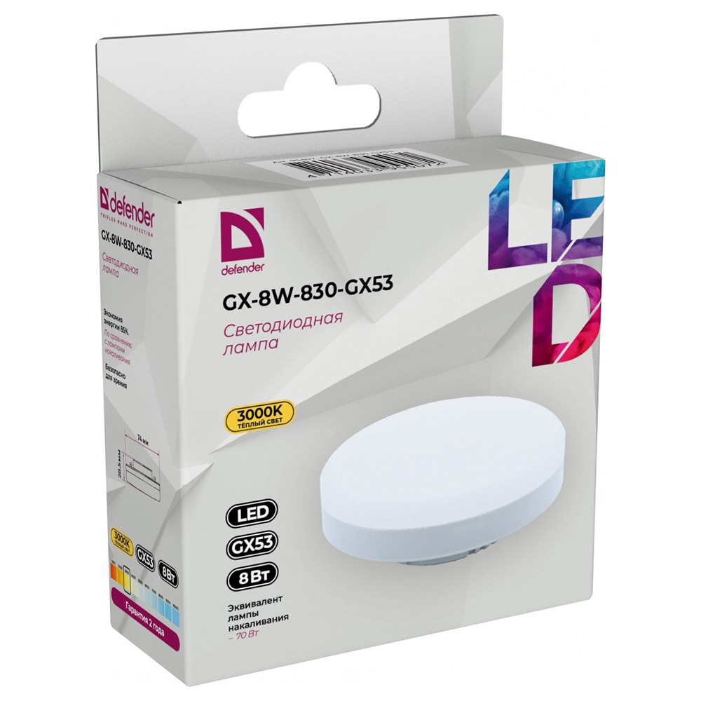 Лампа светодиодная DEFENDER GX 8Вт GX53 3000К таблетка теплый белый (10/100)