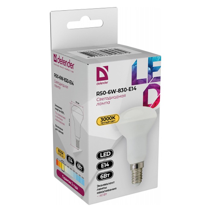 Лампа светодиодная DEFENDER R50 6Вт E14 3000К рефлектор теплый белый (10/100)