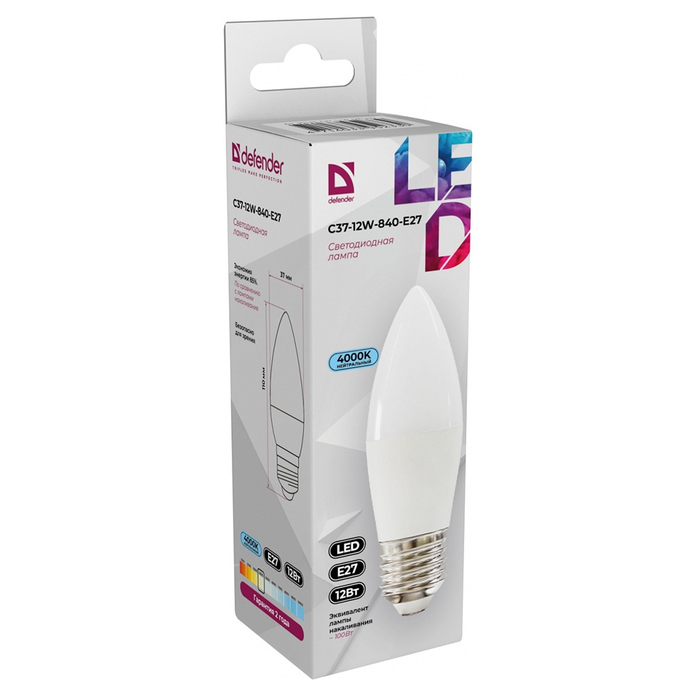 Лампа светодиодная DEFENDER C37 12Вт E27 4000К свеча нейтральный белый (10/100)