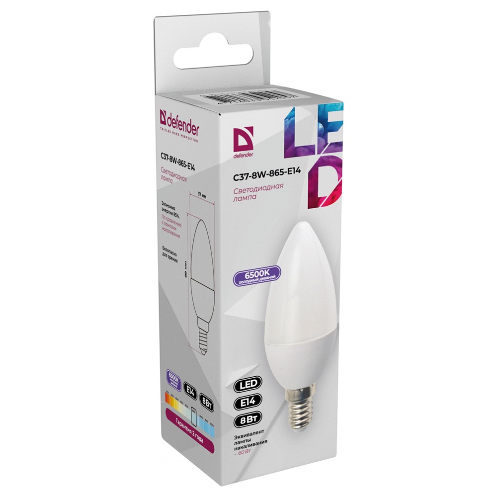 Лампа светодиодная DEFENDER C37 8Вт E14 6500К свеча холодный дневной (10/100)