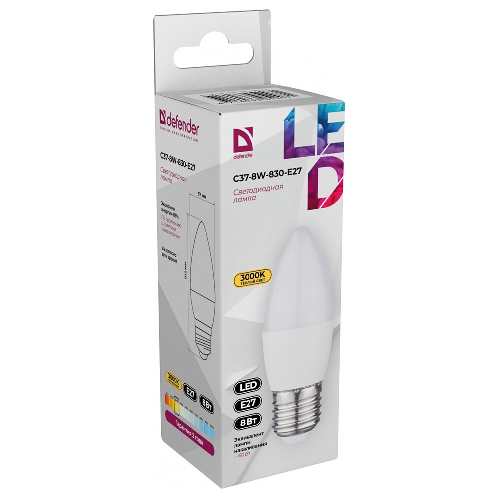 Лампа светодиодная DEFENDER C37 8Вт E27 3000К свеча теплый белый (10/100)