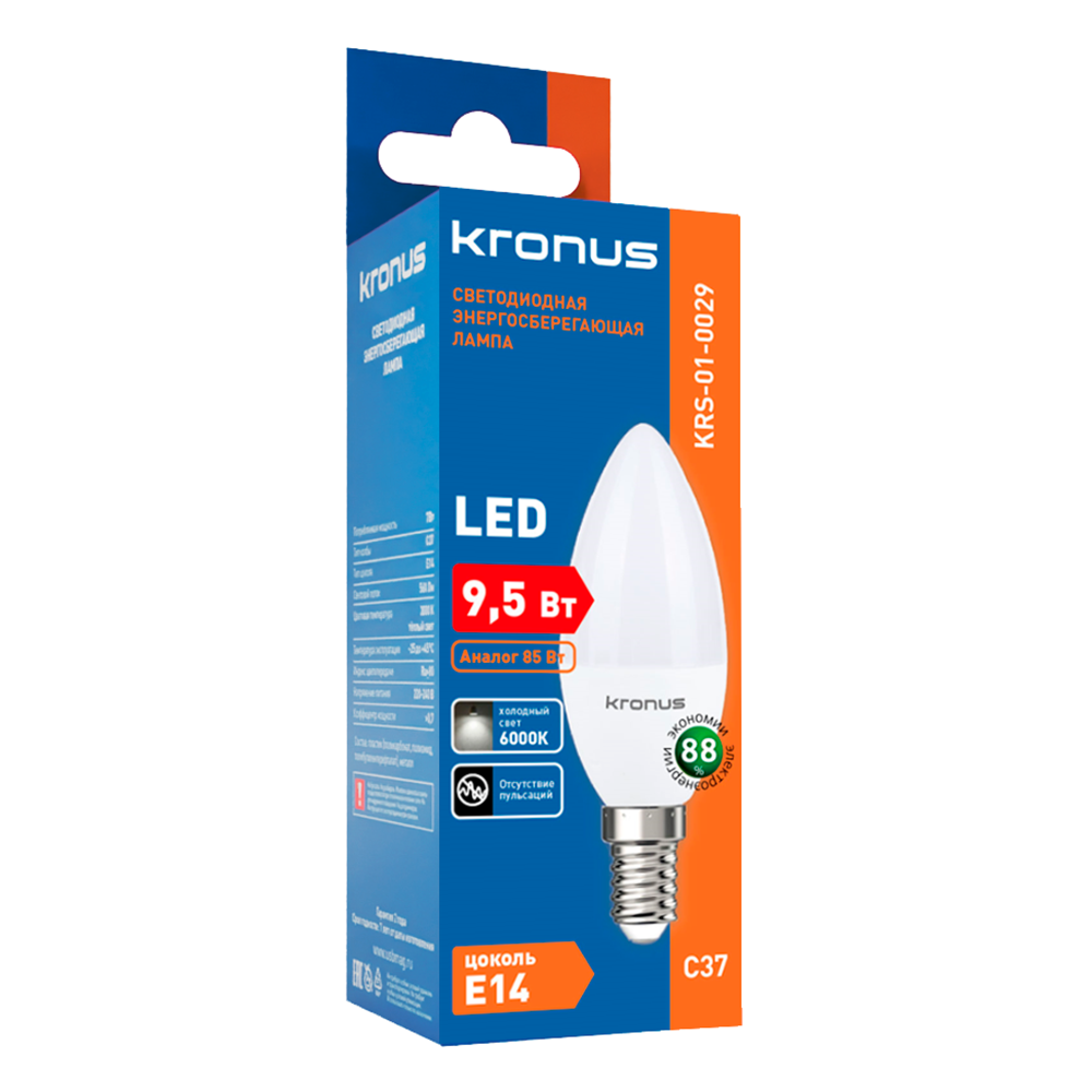 Лампа светодиодная KRONUS C37 свеча 9,5 Вт 220V 6000K E14 холодный свет (10/100)