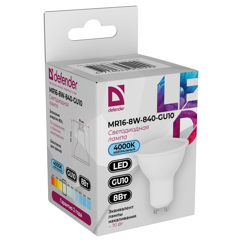 Лампа светодиодная DEFENDER MR16 8Вт GU10 4000К софит нейтральный белый (10/100)