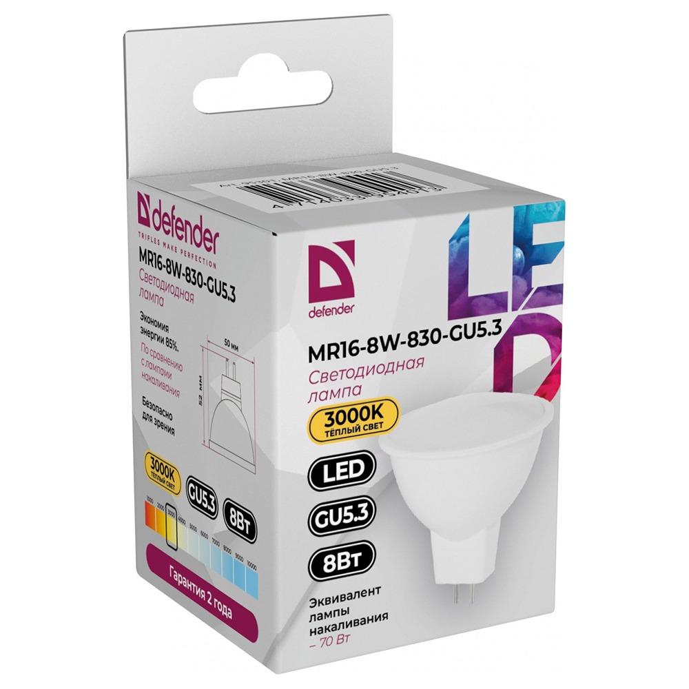 Лампа светодиодная DEFENDER MR16 8Вт GU5.3 3000К софит теплый белый (10/100)