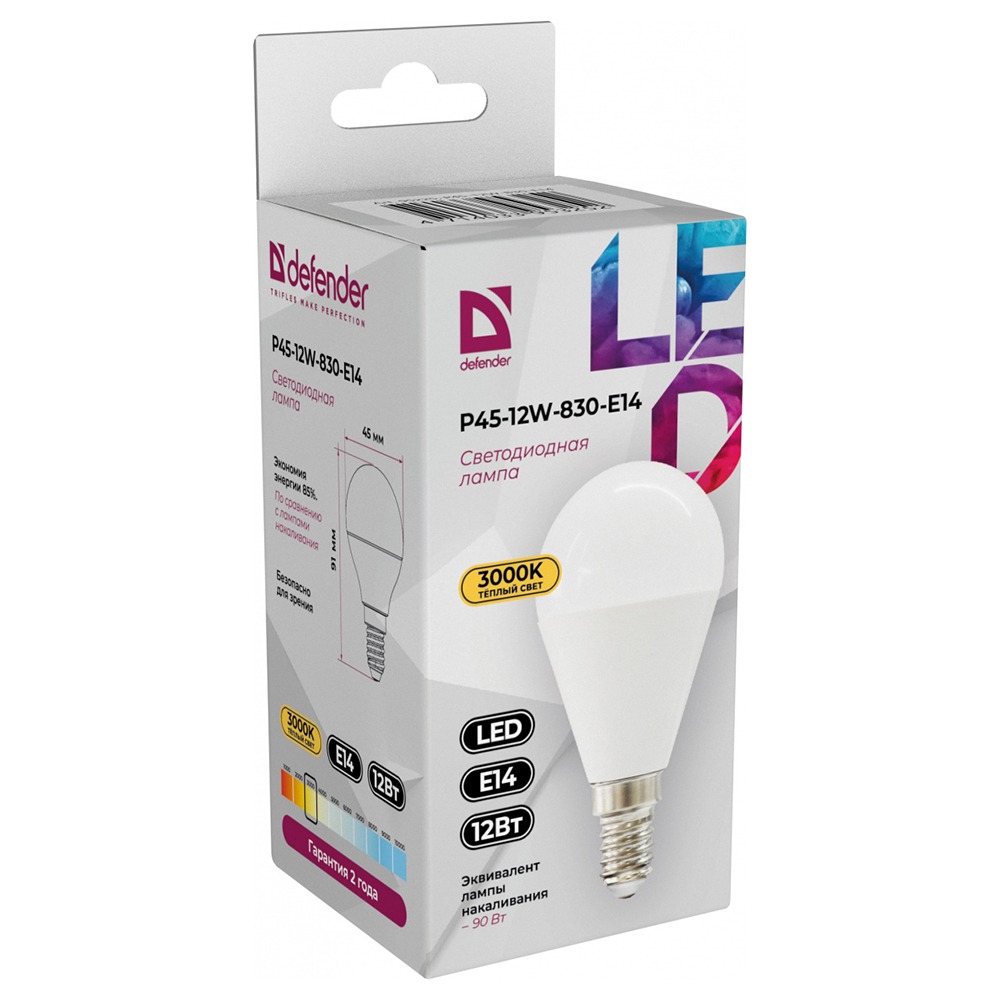 Лампа светодиодная DEFENDER P45 12Вт E14 3000К шар теплый белый (10/100)