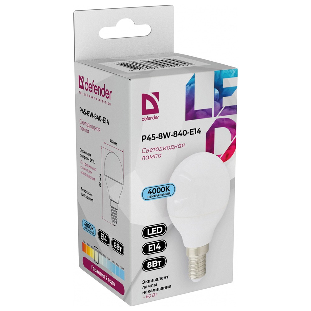 Лампа светодиодная DEFENDER P45 8Вт E14 4000К шар нейтральный белый (10/100)