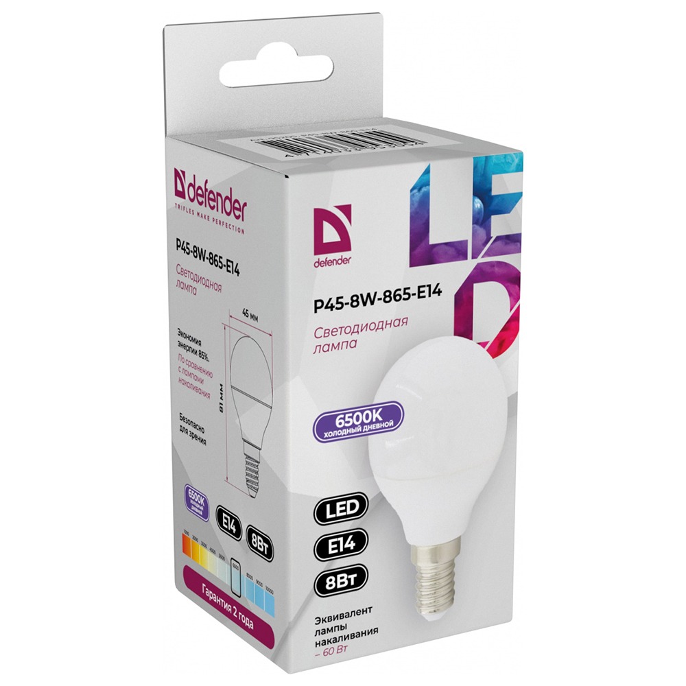 Лампа светодиодная DEFENDER P45 8Вт E14 6500К шар холодный дневной (10/100)