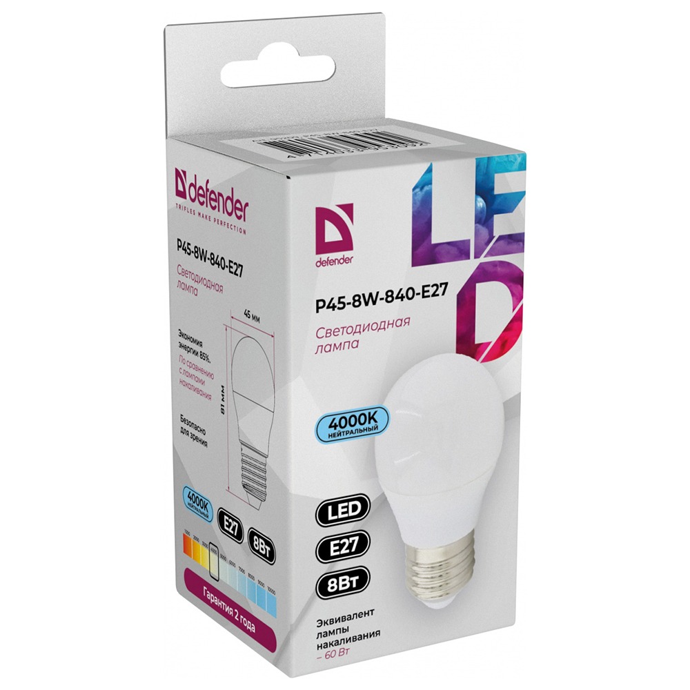 Лампа светодиодная DEFENDER P45 8Вт E27 4000К шар нейтральный белый (10/100)