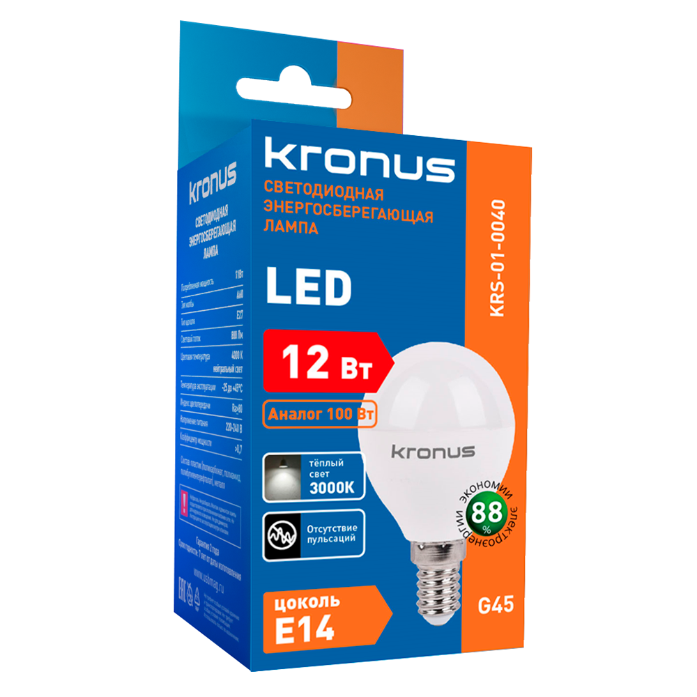 Лампа светодиодная KRONUS G45 шар 12 Вт 220V 3000K E14 тёплый свет (10/100)
