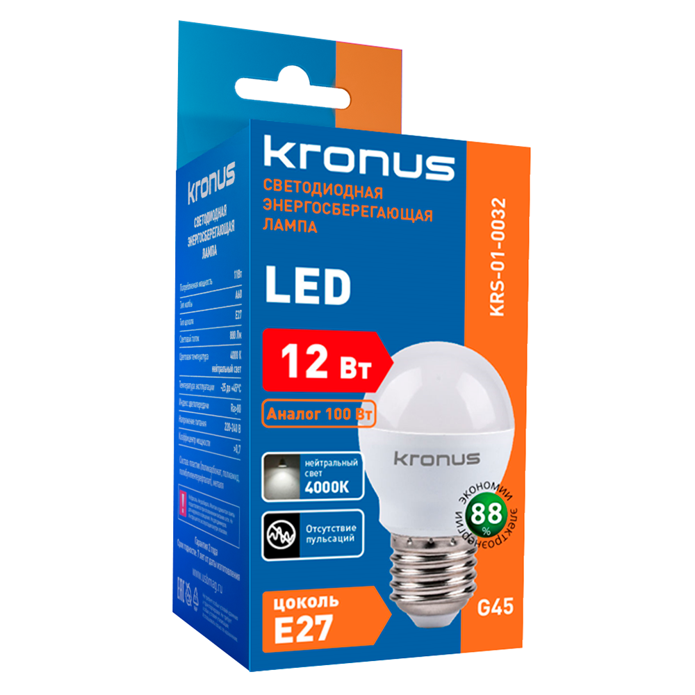 Лампа светодиодная KRONUS G45 шар 12 Вт 220V 4000K E27 нейтральный свет (10/100)