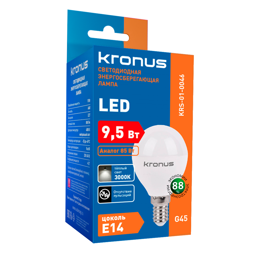 Лампа светодиодная KRONUS G45 шар 9,5 Вт 220V 3000K E14 тёплый свет (10/100)