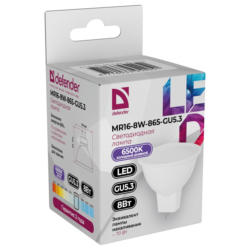 Лампа светодиодная DEFENDER MR16 8Вт GU5.3 6500К софит холодный дневной (10/100)