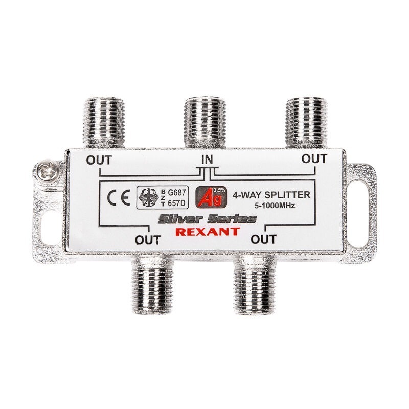 Делитель на 4ТВ 1вход F-гн. - 4 выхода F-гн. 5-1000МГц + 5шт.F Silver в коробочке "Rexant"