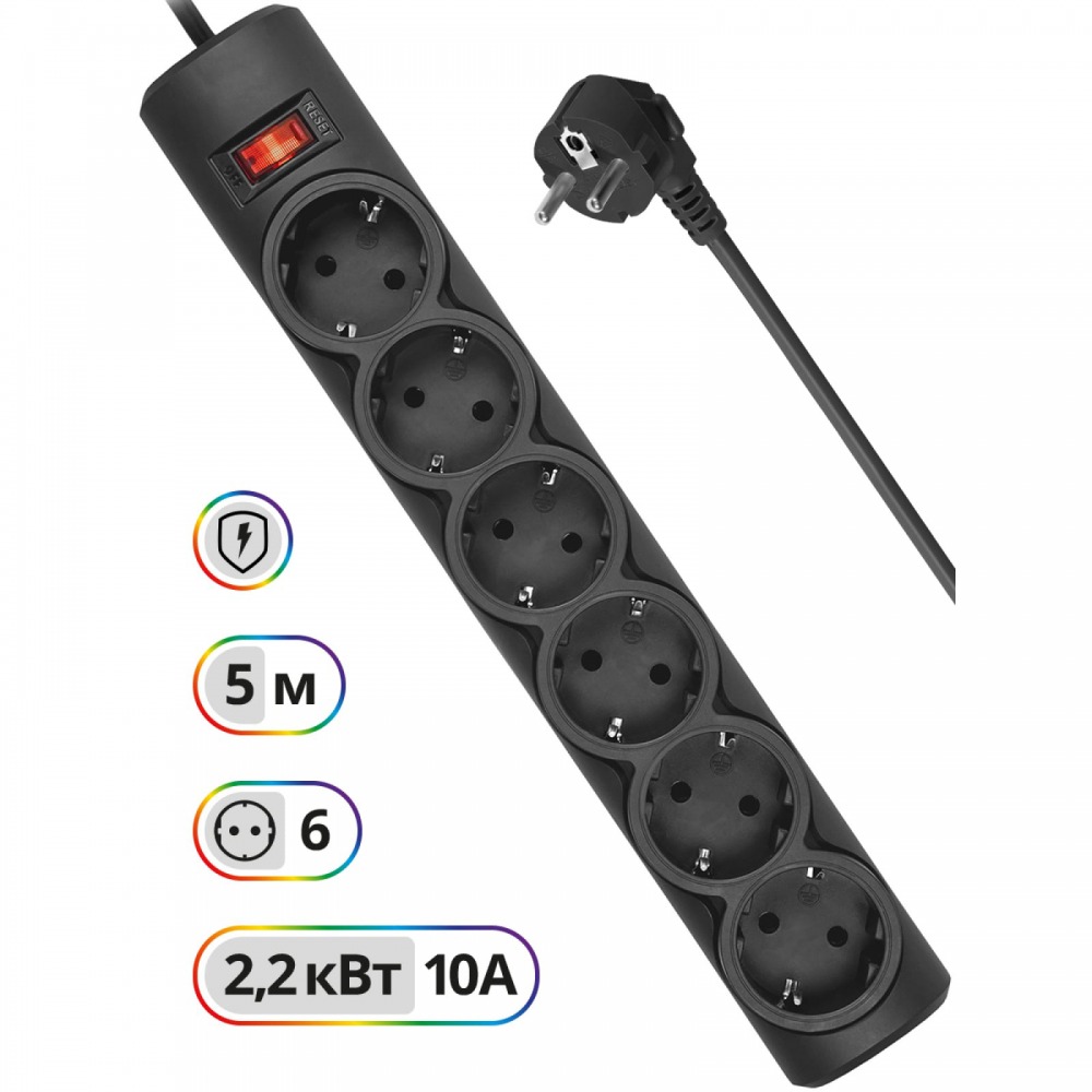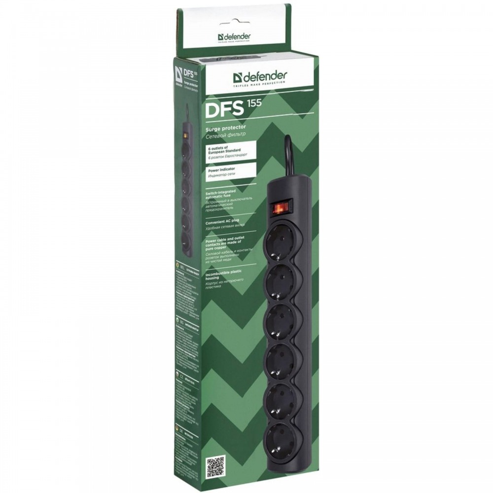 Сетевой фильтр DEFENDER DFS155, 6 розеток, ПВС 3*1,0 мм2, мощность 2200 Вт, ток 10А, чёрный, 5 м (1/