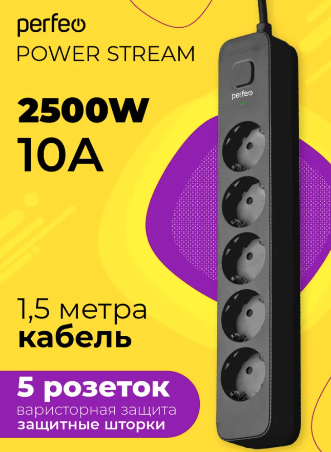 Описание Сетевой фильтр Perfeo "POWER STREAM", 2500W, 1,5м, 5 розеток, черный