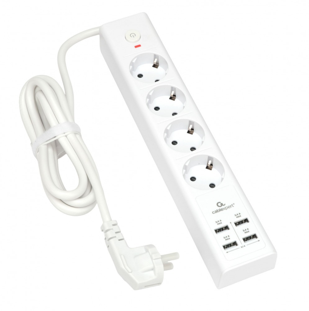 Сетевой фильтр Cablexpert Exnovo, 4 розетки 16А, 3.5кВт, L=2,0м, 4гн.USB 2.4A, белый