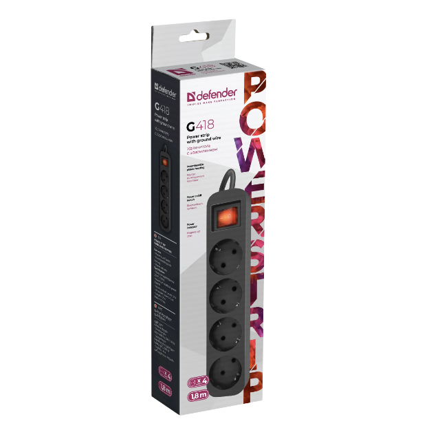 Удлинитель DEFENDER G418, 4 розетки с заземлением 1.8 м