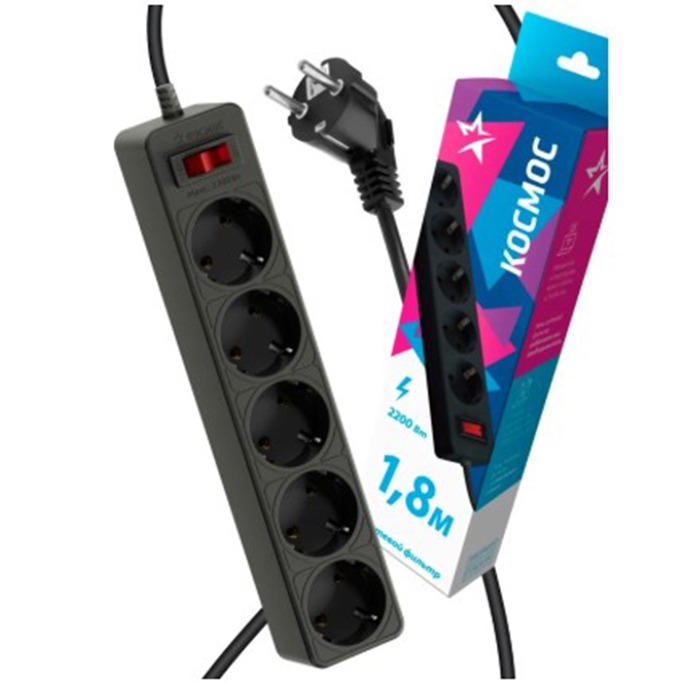 Сетевой фильтр Космос 5р.С/З 10A 1.8м ПВС 3x0.75мм² с выкл. черный (1/20)