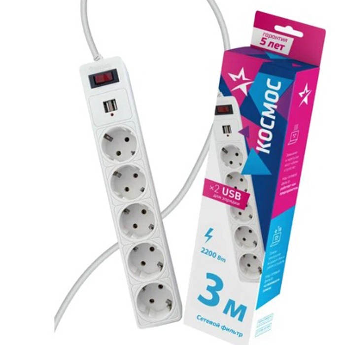 Сетевой фильтр Космос 5р.С/З 10A 3.0м 2USB ПВС 3x0.75мм² с выкл. белый (1/20)