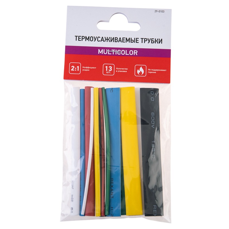 Описание Набор термоусаживаемых трубок ТУТ нг №3 MULTICOLOR 2:1, упаковка 13 шт. по 10 см REXANT (10/250)