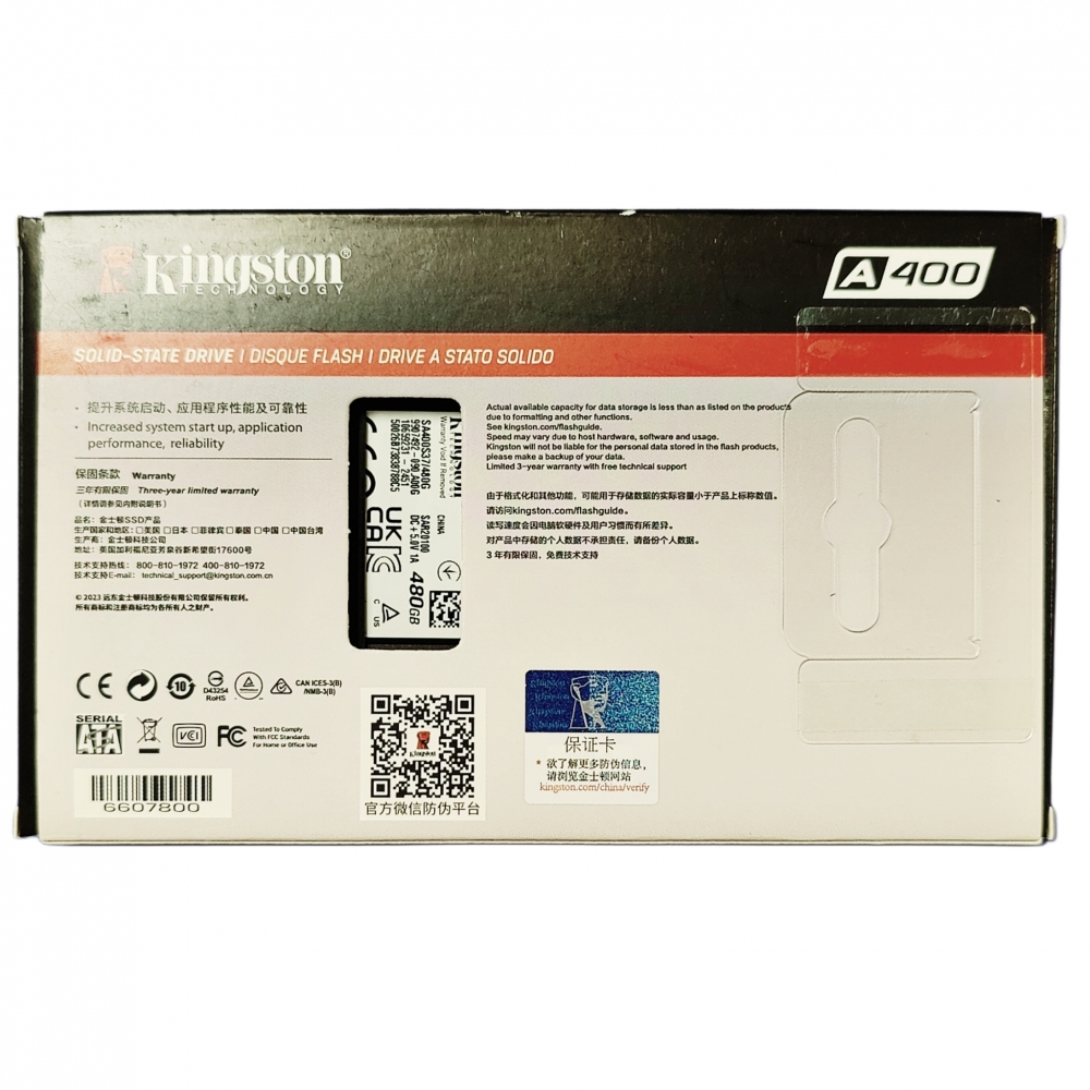 Твердотельный внутренний диск SSD Kingston 480GB A400, SATA-III, R/W - 350/500 MB/s, 2.5", TLC