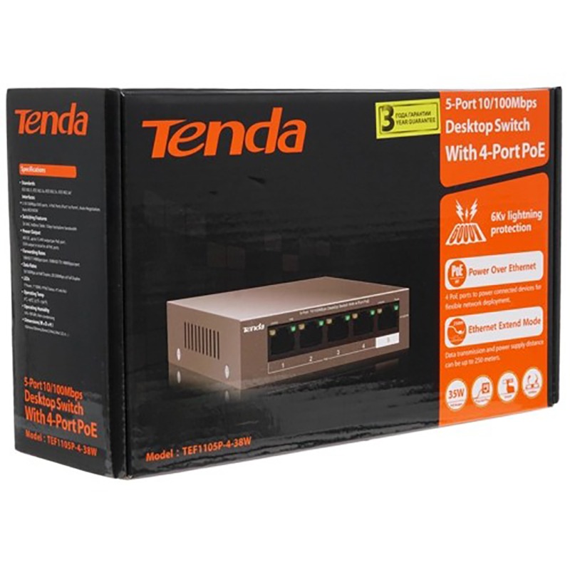 Коммутатор TENDA TEF1105P-4-38W, настольный неуправляемый PoE, 5*10/100Base-TX, мощность до 35 Вт (1/30)