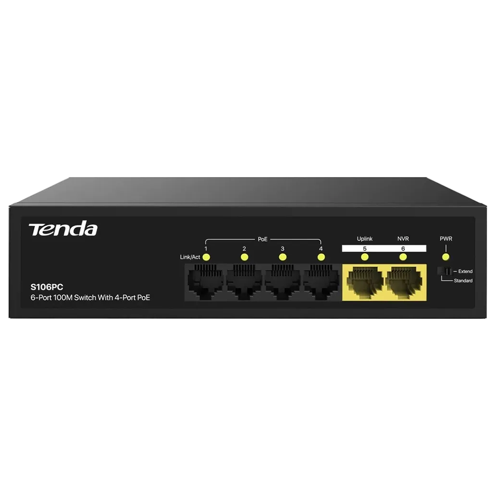 Коммутатор TENDA S106PC неуправляемый PoE , 6 портов, 5x100 Мбит/с, PoE 4х до 30 Вт, настольный , черный (1/20)