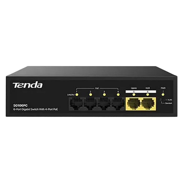 Коммутатор неуправляемый PoE TENDA SG106PC, 6 портов, 6x1 Гбит/с, PoE 4х до 30 Вт, 2хUplink, настольный ,черный (1/20)