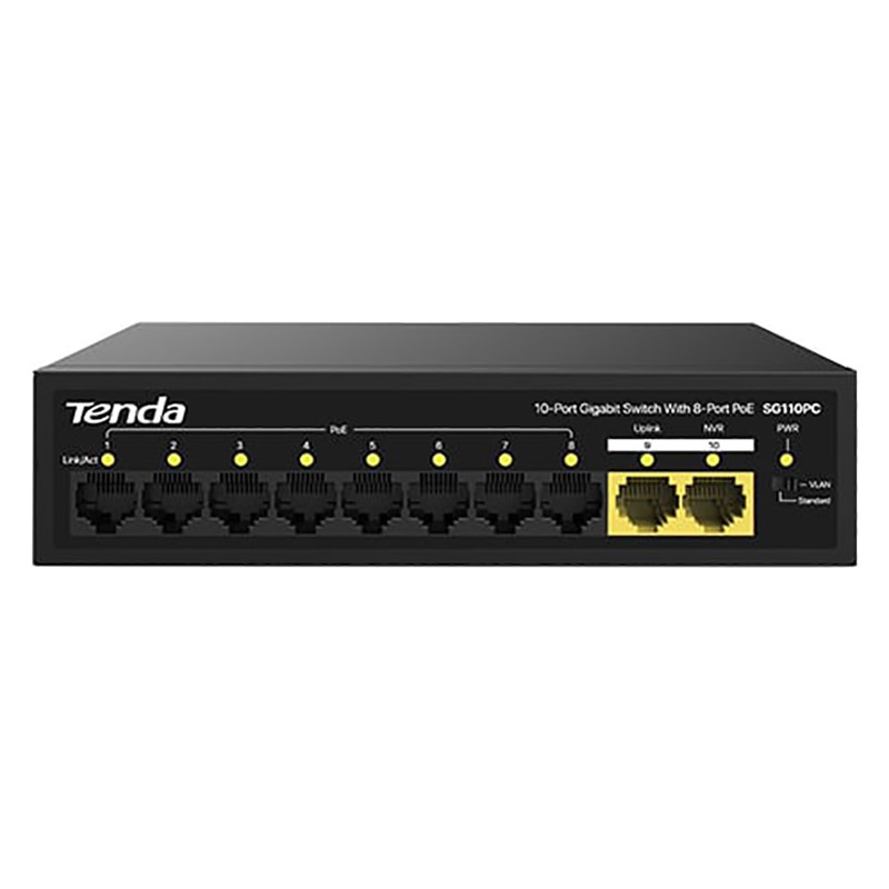 Коммутатор неуправляемый PoE TENDA SG110PC , 10 портов, 10x1 Гбит/с, PoE 8х30 Вт, 2хUplink, настольный ,черный (1/20)