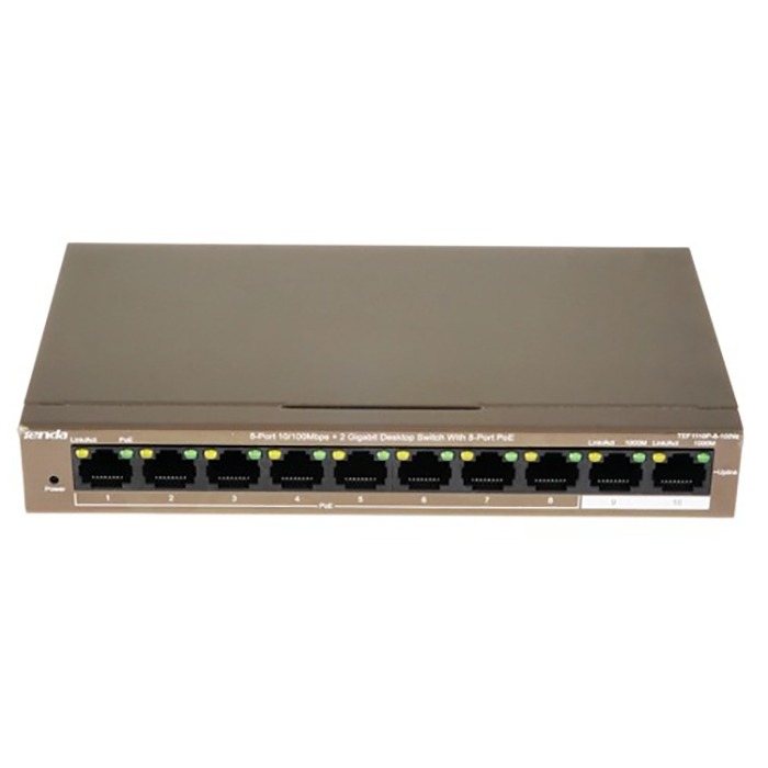 Коммутатор TENDA TEF1110P-8-102W, 8*10/100Base-TX, настольный неуправляемый PoE,(Data/Power) 2*10/100/1000Base-T (Data) (1/10)