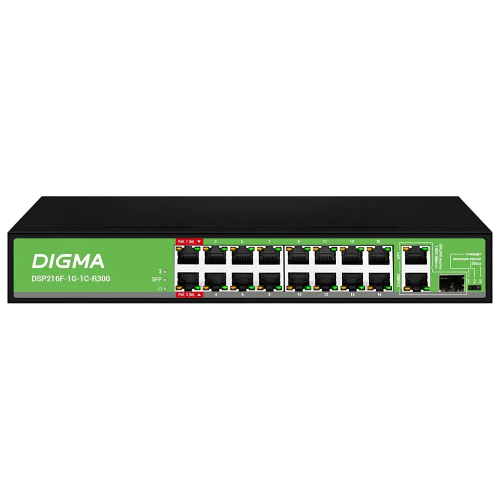 Коммутатор DIGMA DSP216F-1G-1C-R300 (L2) 16x100Мбит/с 1x1Гбит/с 1xКомбо(1000BASE-T/SFP) 16PoE 16PoE+ 2PoE++ 300W неуправляемый