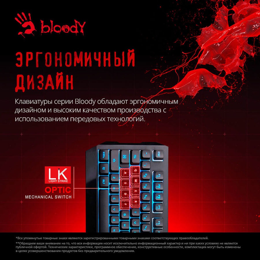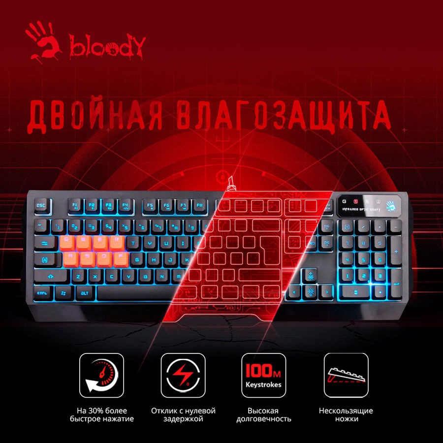 Игровая клавиатура A4Tech Bloody B188 – это уникальное устройство, выполненное в простом, минималистком дизайне. Однако ее конструкция продумана инженерами компании A4Tech до мелочей, благодаря чему Ваши руки не будут уставать в процессе многочасовой игровой сессии.