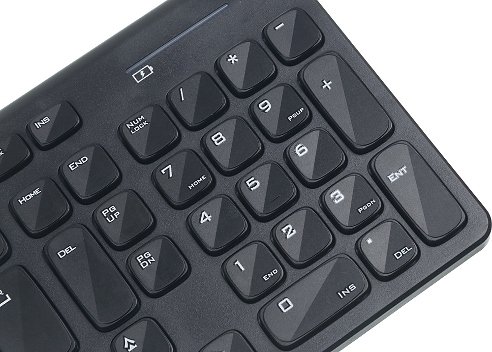 Клавиатура выполнена в slim-формате, который отличается тонкостью и современным стилем. Интерфейс подключения – USB. На устройстве расположены дополнительные мультимедийные клавиши, которые открывают быстрый доступ к функциям управления медиа-контентом. Индикатор на клавиатуре поможет следить за уровнем заряда и своевременно заменить батарейки.