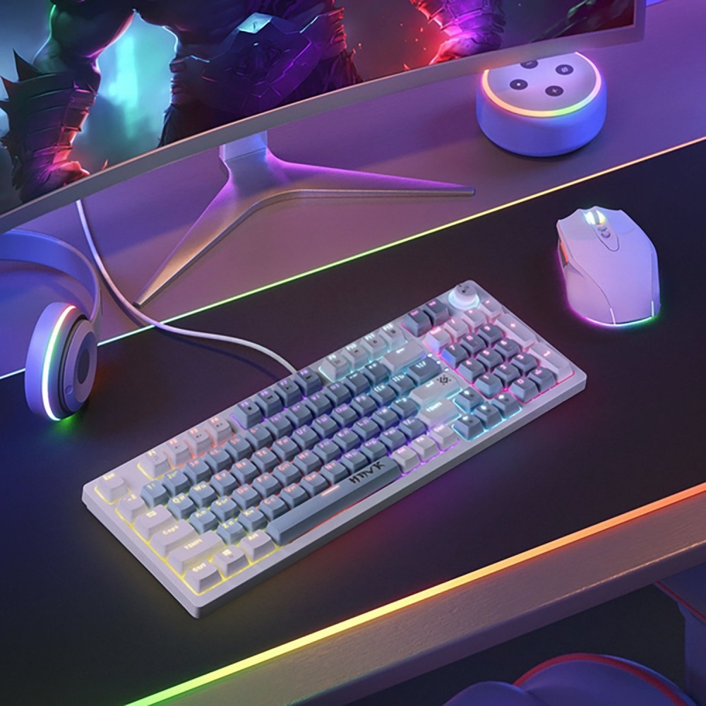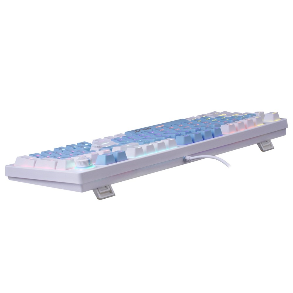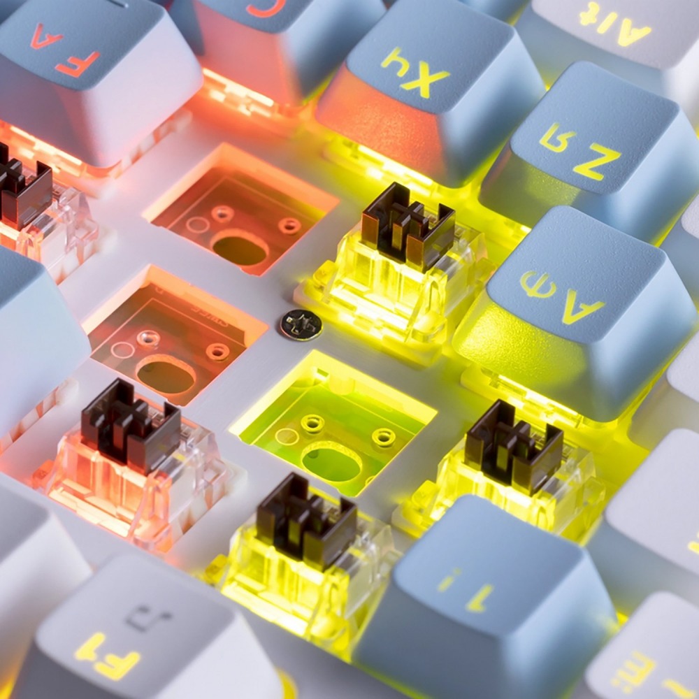 Стильная механическая клавиатура с кейкапами трех цветов и тихими коричневыми свитчами. Главные особенности модели: радужная подсветка, возможность замены свитчей, благодаря технологии Hot Swap, а также наличие кнопки-регулятора для управления громкостью и подсветкой.